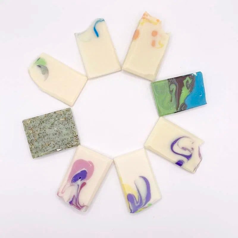 One sample each of all eight regular essential oil bars – Blodau, Botanica, Clarity, Lavender, Serenity, Heulwen, Eryri and Peppermint Scrub. These are end-of-loaf pieces and therefore not all uniform in size or weight, but the combined weight of all nine slices will be 120g and often more.